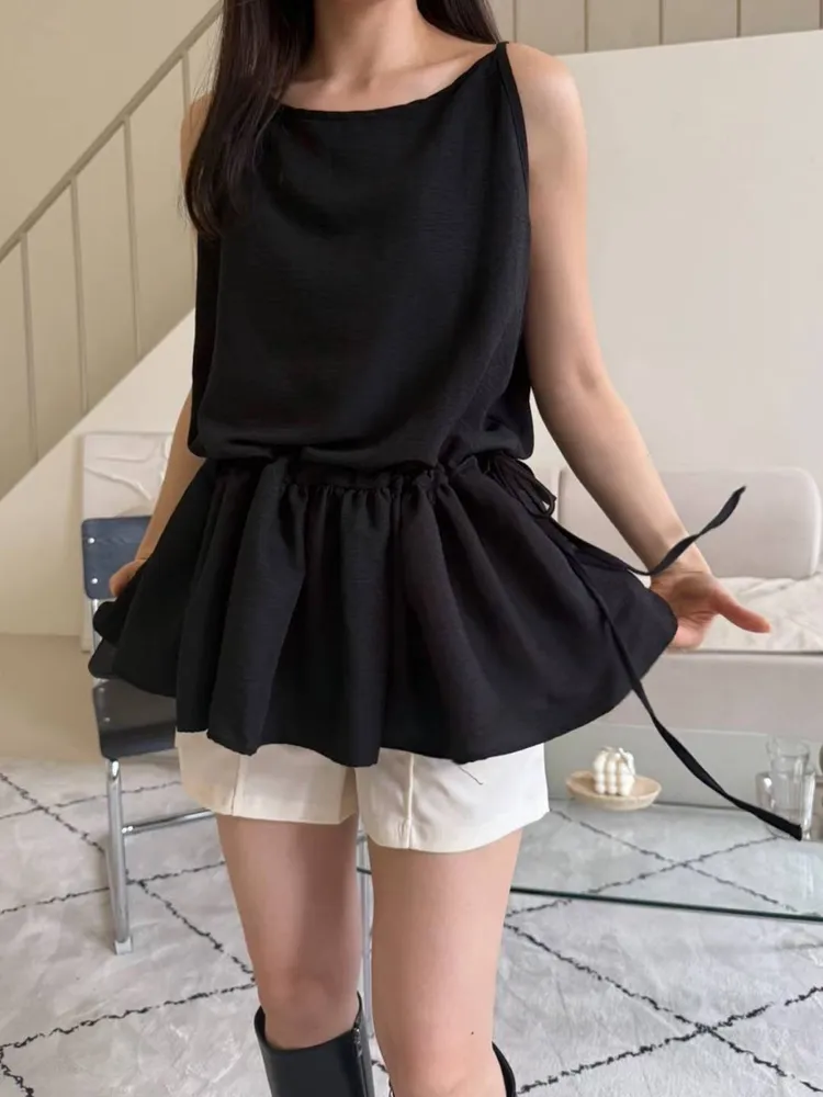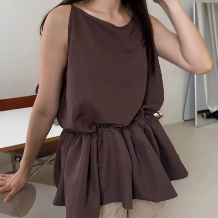 跟剛剛那件綁帶微短版罩衫一套的, 波浪抽繩下擺很俏皮,穿起來很可愛! 下擺抽繩一拉,立刻修飾小腹, 還能帶出很自然的波浪線條,對微肉身型的人超級友好。 布料輕盈卻有質感,搭西裝外套是貴婦感小眾設計, 出國隨便搭條牛仔褲就能拍出精緻旅拍感。 ⠀⠀ 尺寸CM 胸62、長66