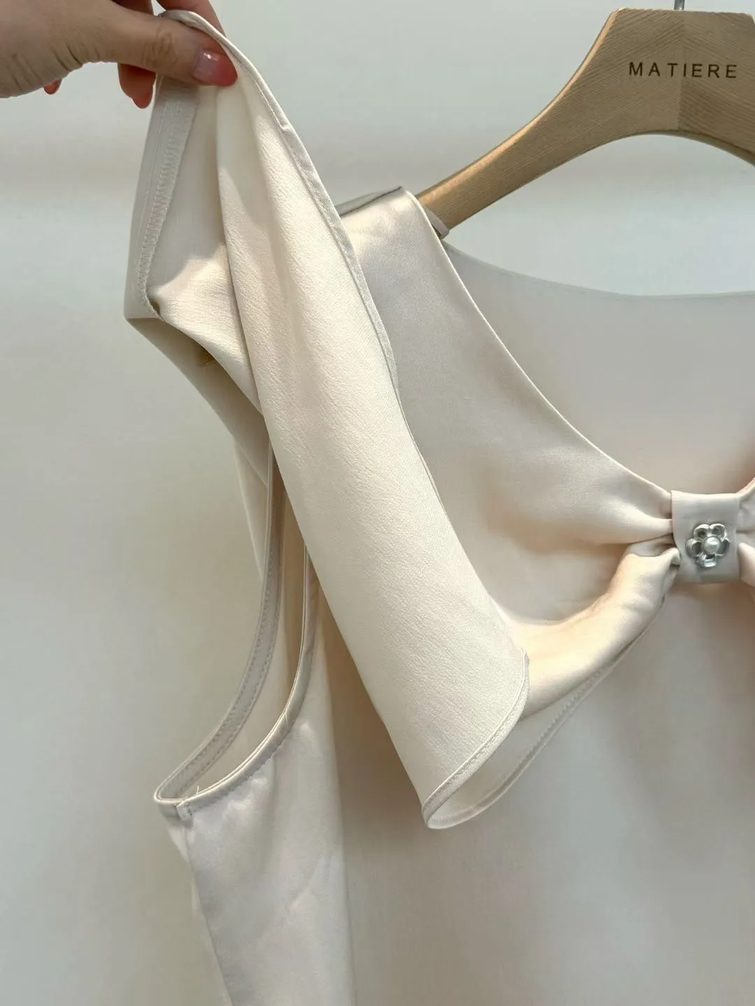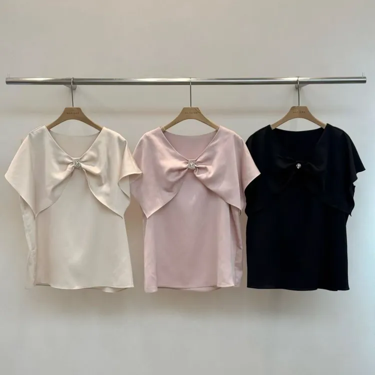 搭配蝴蝶結斗篷狀的造型,中間還有珍珠花朵鈕扣點綴,