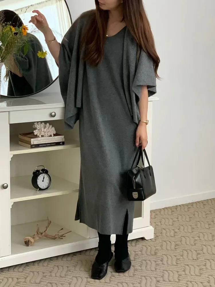 洋裝本身採用柔軟的羊毛材質,親膚不刺癢,穿上一整天都超舒服。修身的剪裁剛剛好,能自然修飾身材比例,走出去氣質感瞬間飆升。單穿就已經很美,但加上斗篷披肩後,整個人直接升級成女神等級。