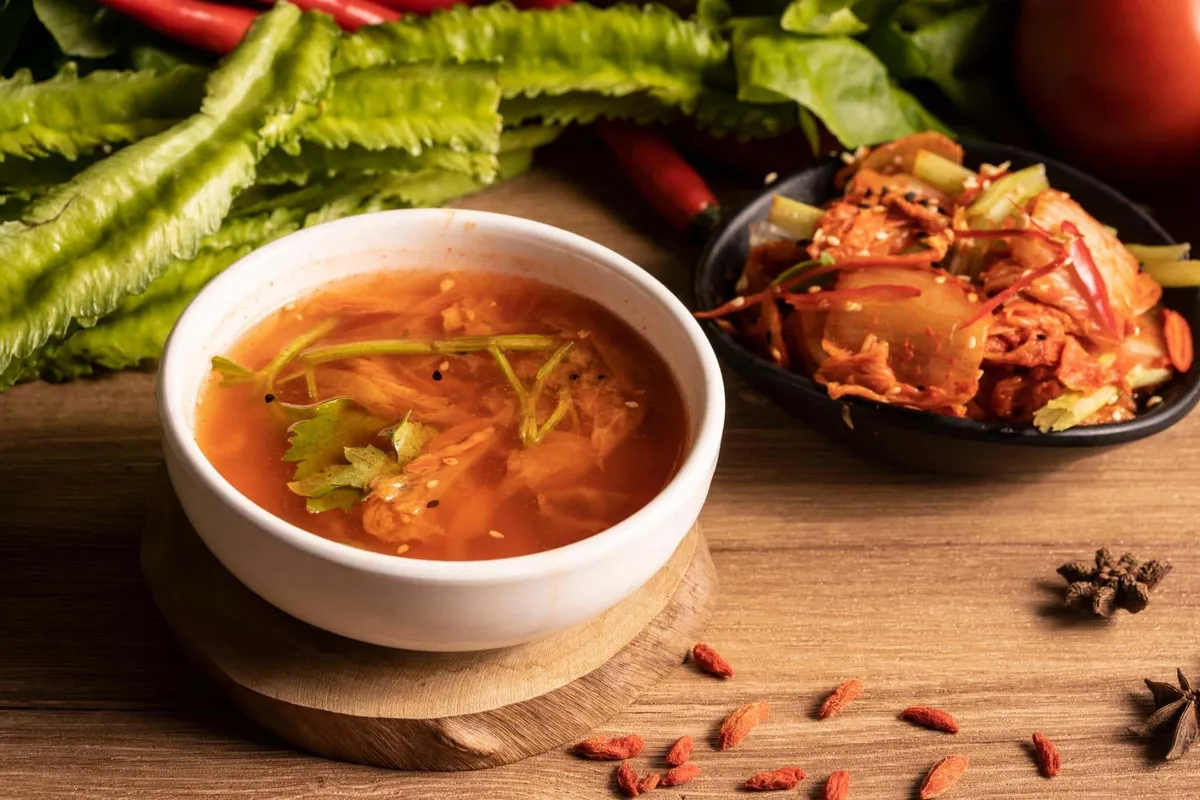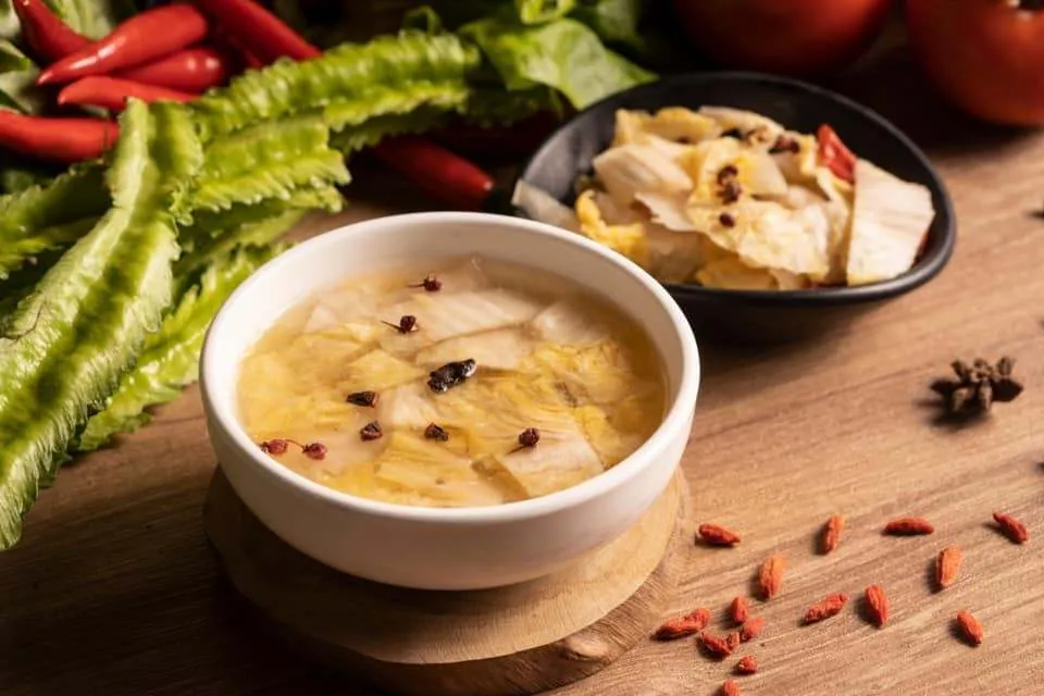 煨入新鮮蔬果高湯一同熬製,湯頭香濃、酸而不澀也不膩口,
