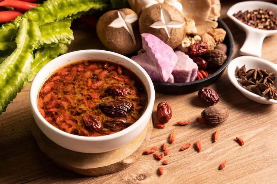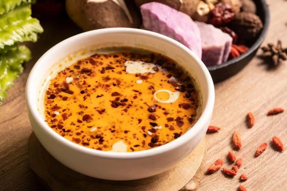麻辣湯底除了點出麻與辣的辣椒及大紅袍,